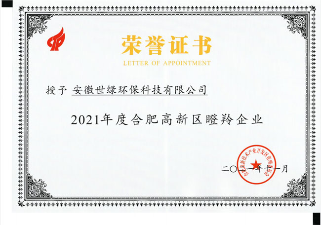 為深入實施創(chuàng)新驅(qū)動發(fā)展戰(zhàn)略,加快培育一批創(chuàng)新能力強(qiáng)勁、發(fā)展?jié)摿薮蟆⒏偁巸?yōu)勢突出的高成長企業(yè),自2018年以來,合肥高新區(qū)已連續(xù)四年開展高成長企業(yè)梯度培育工作,安徽世綠環(huán)保科技有限公司在2019年、2020年連續(xù)兩年被認(rèn)定為高成長雛鷹企業(yè)后,在2021年11月被認(rèn)定為合肥高新區(qū)高成長瞪羚企業(yè)。